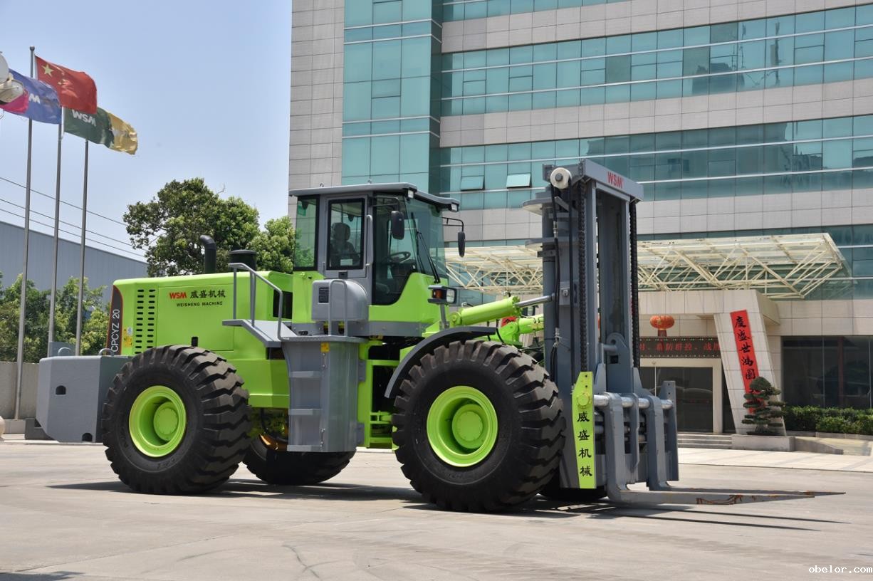 轮式越野叉车是具有双桥驱动及越野性能的内燃平衡重式液力传动叉车。该车具有良好的牵引性能和行驶性能;整车外形美观,操纵简便、舒适,效率高;工作平衡可靠,机动性强,维修方便。它适用于仓库、货场、车站、港口、矿山、工地及一般厂矿企业的货物装卸、堆垛或搬运,还可配装各种专用属具,以适应不同的装卸需要。